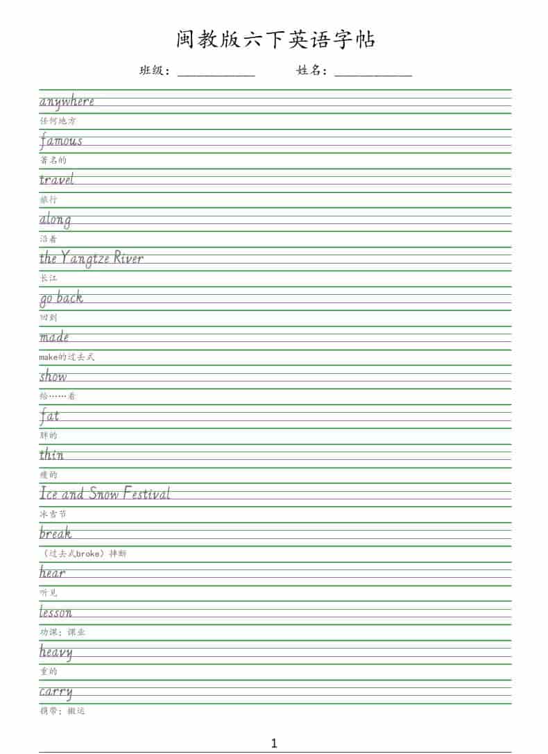 六年级下英语手写体字帖《闽教版》